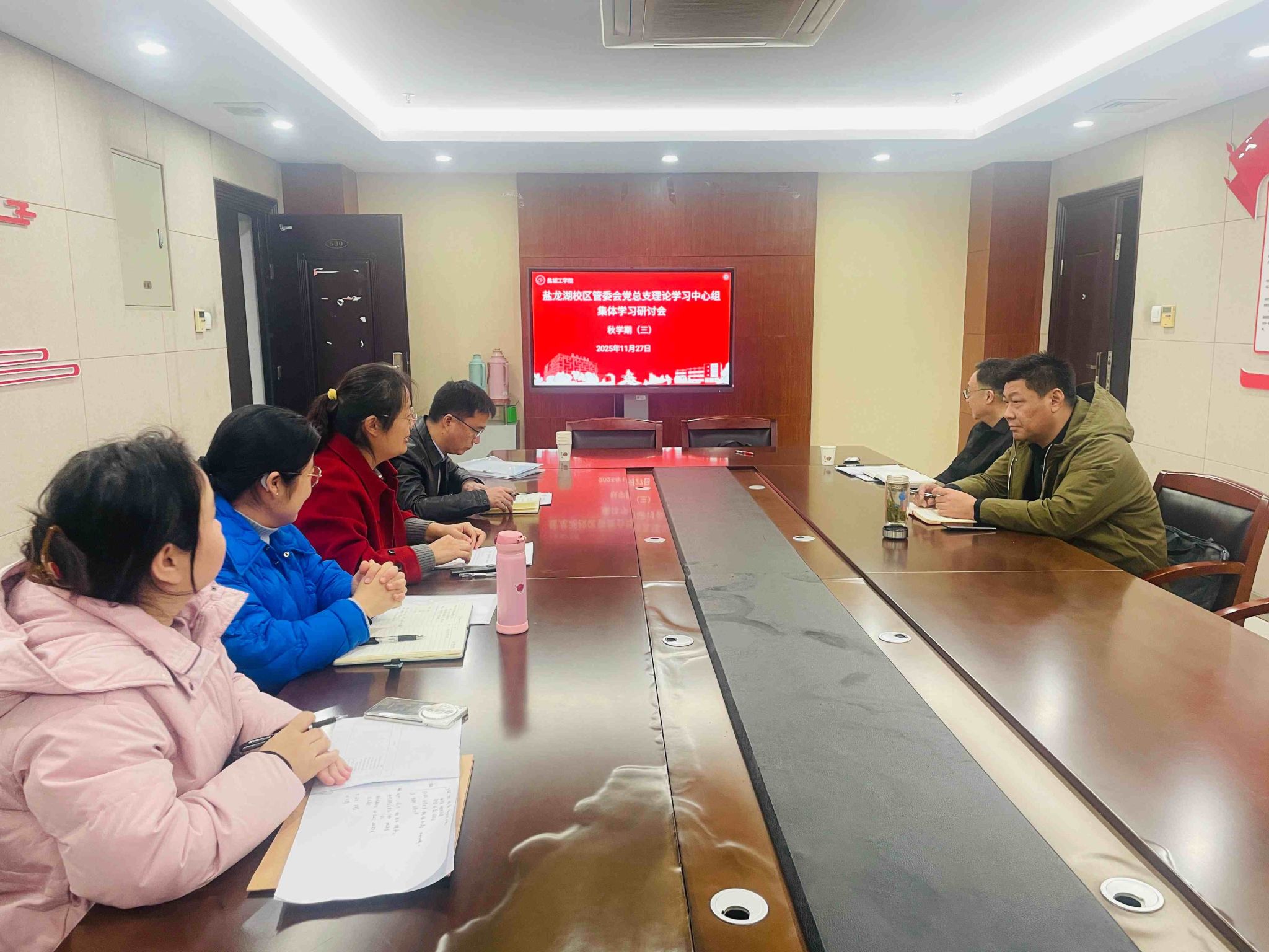 11 月 27 日下午,盐龙湖校区管委会党总支理论学习中心组在行政楼530会议室召开 2025 秋学期第三次集中学习会。副主任、党总支副书记(主持工作)赵云峰主持会议,党总支理论学习中心组成员参加。