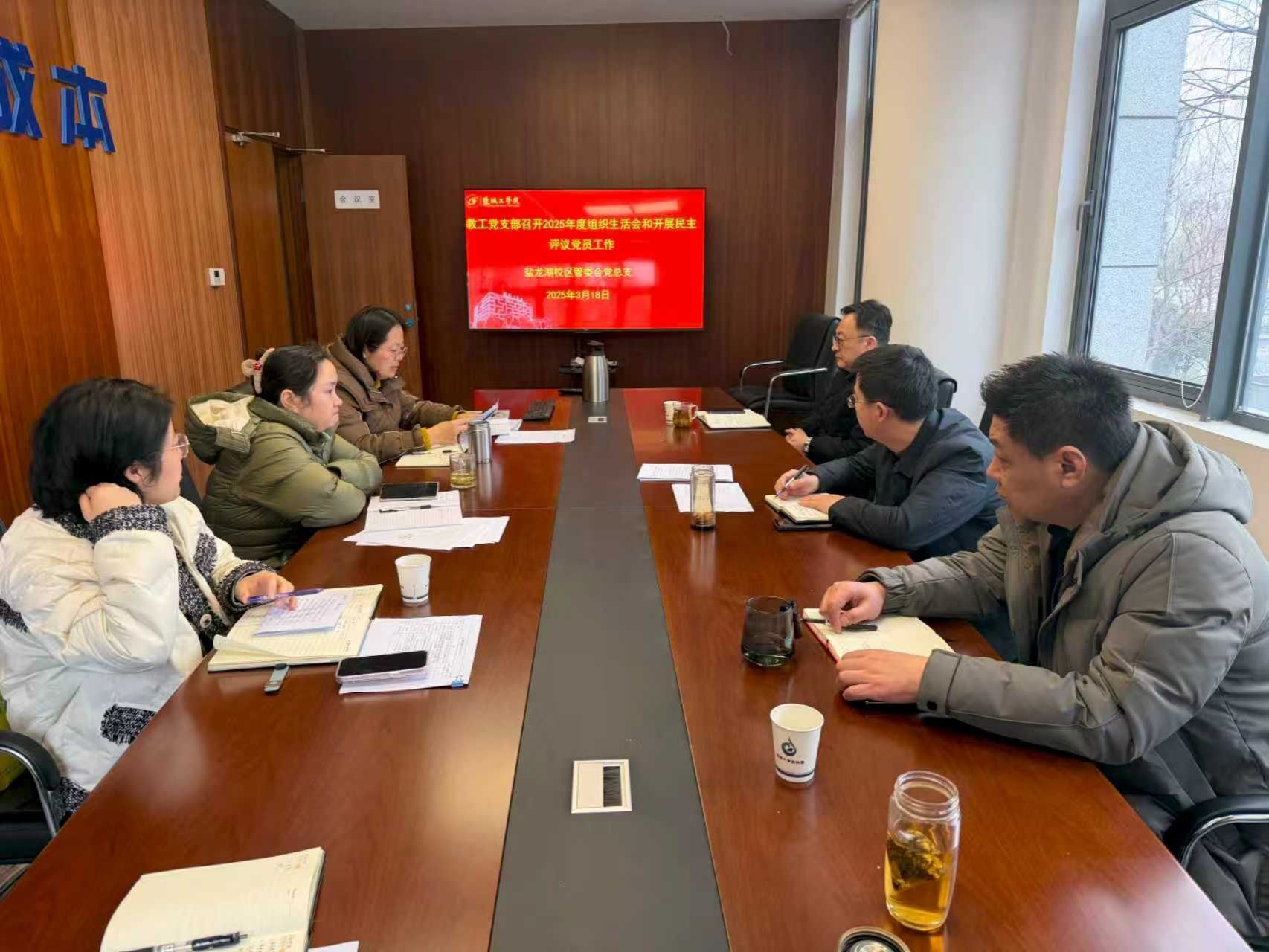 根据盐工委〔2026〕1 号文件《关于召开 2025 年度基层党组织组织生活会和开展民主评议党员工作的通知》要求,在盐龙湖校区管委会党总支的统筹指导下,部门教工党支部严格遵循“会前充分准备、会上严肃认真、会后狠抓落实”的工作原则,扎实完成会前学习、谈心谈话等各项筹备工作后,于3月18 日下午,在大学科技园E1南楼二楼会议室召开2025年度组织生活会和开展民主评议党员工作,支部书记张秀丽主持,支部全体党员参加。