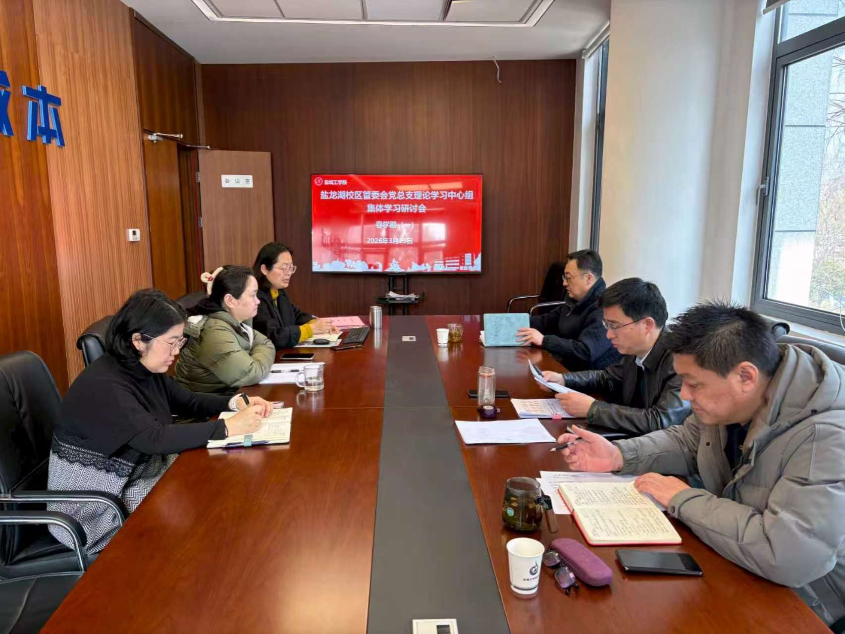3 月 25日上午,盐龙湖校区管委会党总支理论学习中心组在大学科技园E1南楼二楼会议室召开3月份集体学习研讨会。副主任、党总支副书记(主持工作)赵云峰主持会议,中心组全体成员参加。