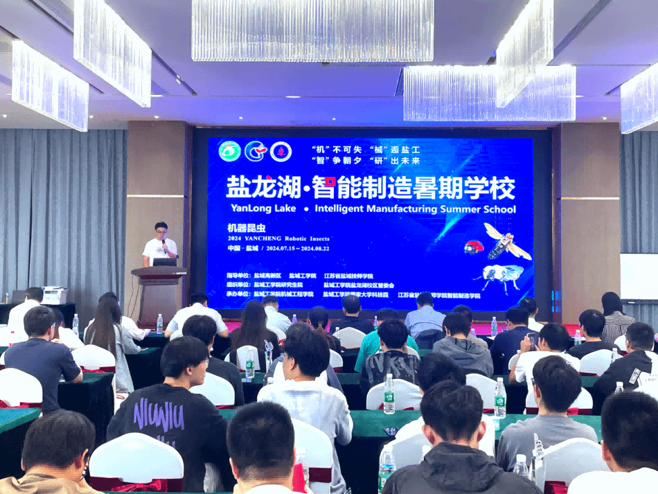 在结业典礼上,首先,学校领导、教师团队以及全体2024级研究生通过一段视频短片共同回顾了暑假期间的学习历程。随后,80名2024级研究生被分成八个小组,他们展示了各自的机器昆虫项目,并进行了汇报答辩。指导老师卢倩对各小组的方案进行了细致的点评和互动交流。紧接着,由盐城工学院和盐都高新区等单位组成的九位专家评委团进行了现场评分,并评出了奖项,包括四个三等奖,三个二等奖,以及一个一等奖。最后,研究生学员代表蒲一雄同学发表了深刻的学习感言。